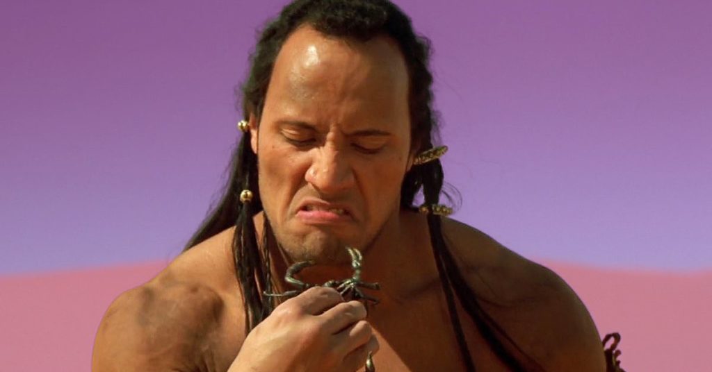 Nella sequenza di apertura di The Scorpion King, un accampamento barbaro dell’età del bronzo celebra la cattura di Jesup (Branscombe Richmond), uno degli ultimi sopravvissuti della tribù rivale accadica. I contenitori vengono issati. Uomini sporchi e temprati dalla battaglia esultano. Le donne seminude posano come se fossero sedute per i ritratti di Frank Frazetta. Poco prima che il capo barbaro possa giustiziare il suo prigioniero, un intruso si schianta sulla scena, creando il primo grande set d’azione del film. L’intruso è il fratellastro di Jesup, Mathayus (Dwayne “The Rock” Johnson), il cui telaio cesellato di 6 piedi e 5 è illuminato e incorniciato per il massimo potenziale di osservazione. La sua prima battuta, data a una stanza piena di guerrieri spaventati e dei loro ospiti della festa: “Boo”. Ne consegue una mischia, nasce una star – e così è il blockbuster moderno. Nessuno lo sapeva all’epoca, ma Il Re Scorpione era stranamente preveggente. Visto oggi, sembra un primo esempio dei film che dominano il botteghino.