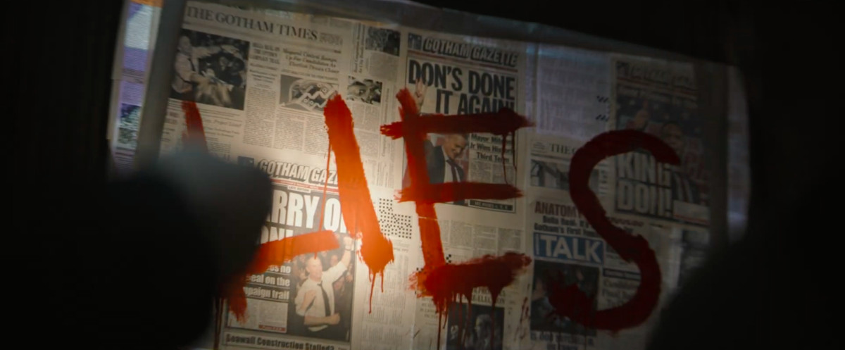 Le prime pagine dei giornali sembrano essere state incollate su una finestra, con la parola “BUGIE” scarabocchiato sopra con vernice rossa. Sembrano tutti riferirsi alla rielezione del sindaco di Gotham Don Mitchell Jr. per un terzo mandato, rendendo probabile che la vittima con la faccia da nastro sia lo stesso sindaco Mitchell. Il seggio del sindaco potrebbe anche essere un punto della trama perché l’attrice Jayme Lawson è stata scelta per il ruolo di Bella Reál, una candidata a sindaco di Gotham.