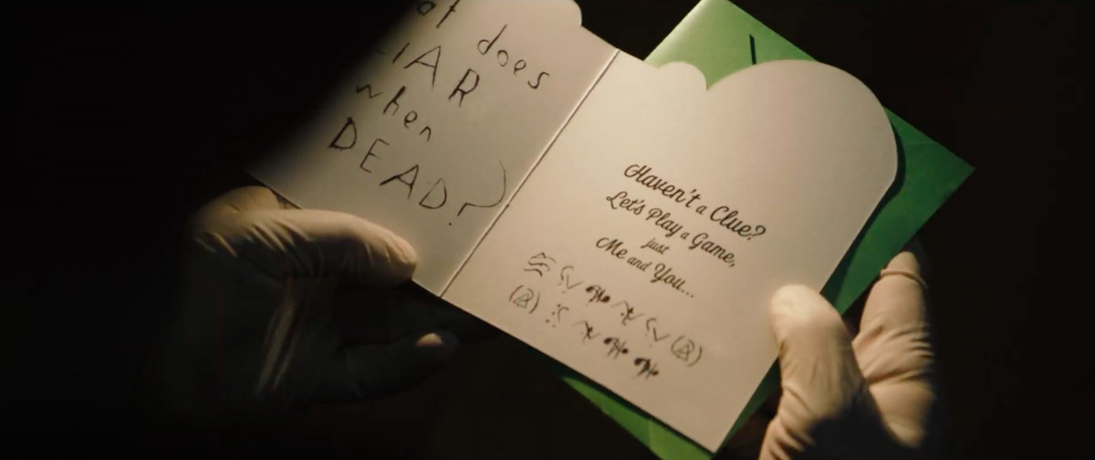 Il nuovo volto di Tape Man dice “NIENTE PIÙ BUGIE”. L’Enigmista sembra essere piuttosto arrabbiato per le falsità in tutto il trailer. Potrebbe esserci una connessione qui con i punti che Reeves ha lasciato cadere durante il panel: parte dell’arco di Bruce nel corso del film è scoprire cose nuove sul posto della sua famiglia a Gotham City.