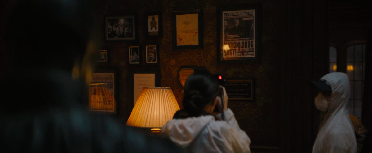 Un fotografo della scena del crimine scatta una foto della prima pagina di un giornale incorniciata e macchiata di sangue, che dichiara “MARONI DRUG BUST”. Sal Maroni è il boss della mafia che ha gettato l’acido in faccia ad Harvey Dent, creando l’alter ego criminale di Harvey Dent, Due Facce.