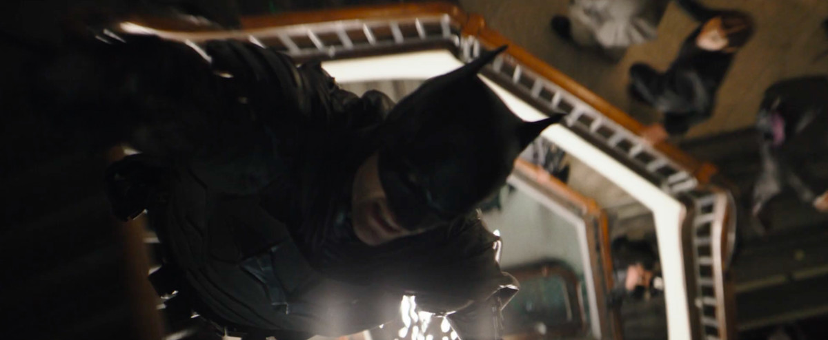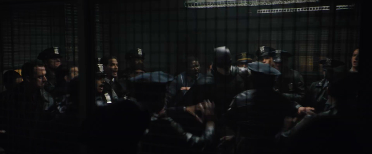Batman si cala in corda doppia su un rampino attraverso una scala a chiocciola, mentre la polizia spara su di lui. Forse quella rissa di prima si è trasformata in qualcosa di più grande.