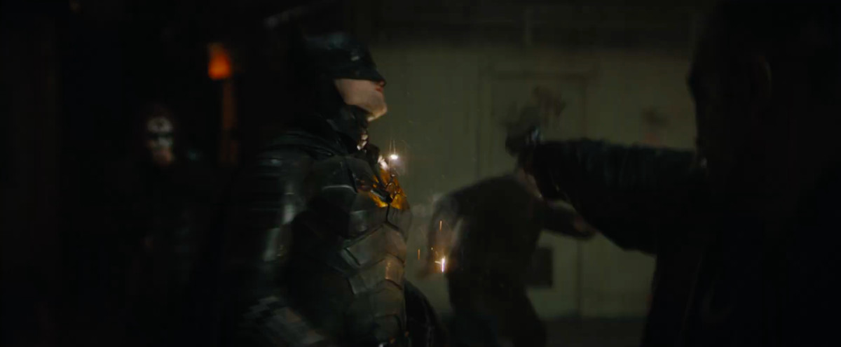 Un membro di una gang con la faccia da teschio spara a Batman al petto a bruciapelo. Se ricordi, il costume di Batman di Pattinson ha un simbolo di pipistrello che potrebbe essere fatto di pistole. Spiegheremo.