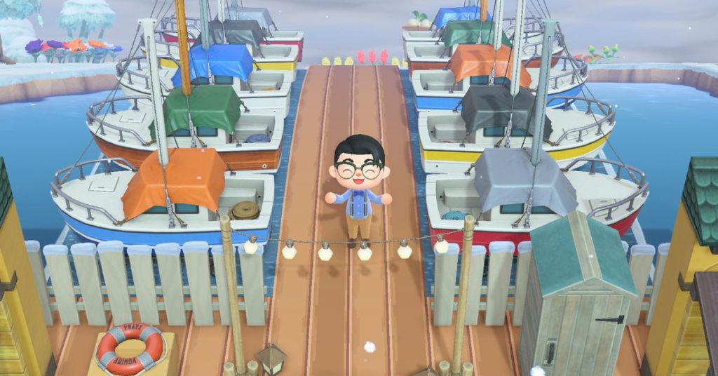 Dopo aver visto l’oggetto yacht, sapevo che dovevo creare un porto turistico! Penso di aver tirato fuori l’illusione che non siano solo seduti a terra. da Animal Crossing