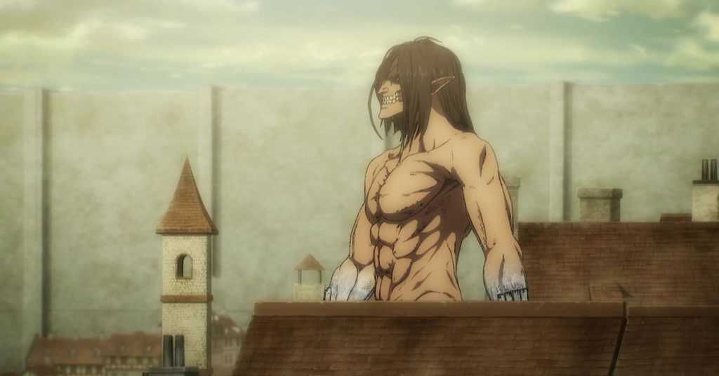 La sequenza di apertura di Attack on Titan è di sereno terrore: mentre le oche volano in alto sopra una città rustica baciata dal sole, una gigantesca figura umanoide fa capolino oltre le pareti con un’espressione nuda, muscolata e vuota. “Quel giorno, l’umanità ha ricordato il terrore di essere governata da loro”, ci viene raccontato attraverso la narrazione, creando una serie permeata dall’ansia abituale e dall’orrore prevalente. Subito dopo, “Guren no Yumiya” di Linked Horizon, un tema di apertura che diventerà rapidamente iconico nel fandom dell’anime, prende il via e inizia L’Attacco dei Giganti.