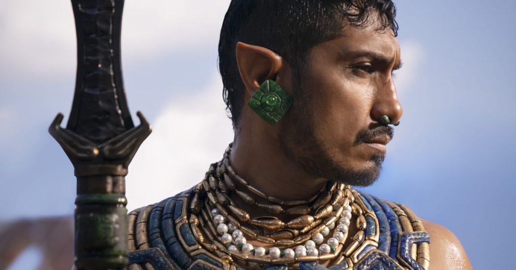 “La sua gente”, dice M’Baku di Winston Duke in una delle letture più memorabili del film, “non lo chiamano generale o re. Lo chiamano K’uk’ulkan: il dio serpente piumato”. È un livello di mistica che Namor è all’altezza della prima volta che parla da solo, intrufolandosi nella terra nascosta del Wakanda. In meno di un minuto, la performance di Tenoch Huerta si aggiunge al mito, impregnando il suo primo, breve monologo di meraviglia, curiosità, storia e minaccia. È come niente che abbiamo visto prima. È K’uk’ulkan, come lo chiama la sua gente. Egli è anche, come intona alla regina Ramonda, Namor ai suoi nemici.