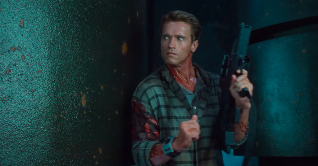 Arnold Schwarzenegger si tira fuori dal naso un gigantesco dispositivo di localizzazione in metallo non è mai stato così bello.