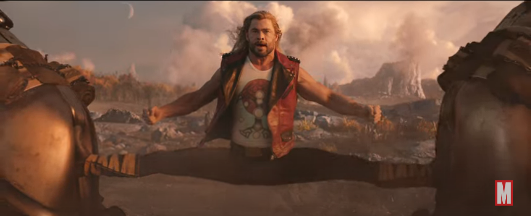 C’è una parte diversa del trailer ispirata agli anni ’80 che ha attirato la mia attenzione: Chris Hemsworth sta fingendo di fare le divisioni. Chiaramente influenzato dalle incredibili imprese di Jean Claude Van Damme, vediamo Thor saltare in aria per intercettare due veicoli in corsa diretti verso di lui, tenendoli in posizione con la sola forza delle sue gambe.