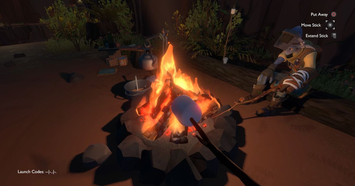 “Ha sempre incarnato la parte ‘campeggio’ dell’estetica del campeggio e dello spazio”, ha detto Beachum. Non voleva che l’avventura di fantascienza avesse un “corridoio di mezzo” comune alla fredda freddezza di altre avventure spaziali, e arrostire un marshmallow ha portato un calore nel mondo del gioco. Beachum sperava anche di usare il fuoco da campo come un modo per enfatizzare la differenza di scala tra arrostire un marshmallow e l’universo che esplode sopra di te. “L’intero gioco è incentrato su cose come la natura, le forze e le cose che cadono a pezzi al di fuori del tuo controllo. E poi il marshmallow è come questo piccolo momento che puoi controllare.