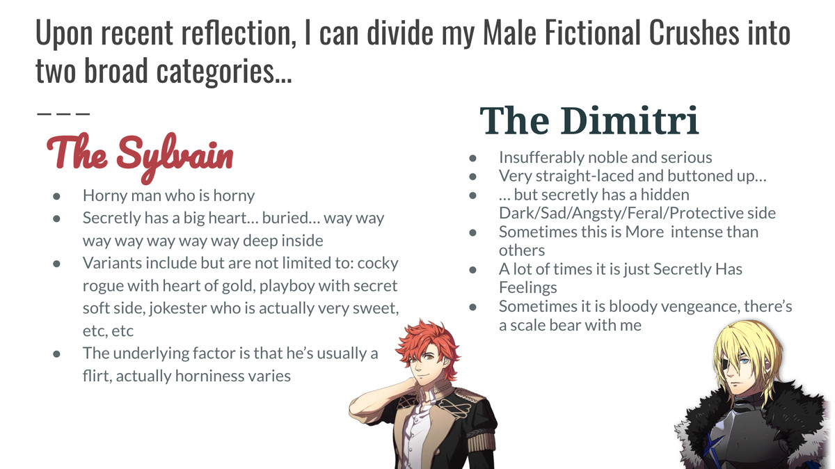 Ogni diapositiva dovrebbe rafforzare la tua tesi centrale. Alcune persone potrebbero optare per un ambito ristretto, il che è completamente valido. Mi piace lanciare la mia rete larga per mostrare quanto sia onnicomprensiva la mia teoria. In questa presentazione particolare, ho usato Jeff Winger di Community, Han Solo di Star Wars, Aaron Hotchner di Criminal Minds e Chrom di Fire Emblem: Awakening per illustrare la mia tassonomia. Una vasta gamma di intrattenimento! (Inoltre, in questo modo non si trattava solo di ragazzi anime, questo è un articolo separato).