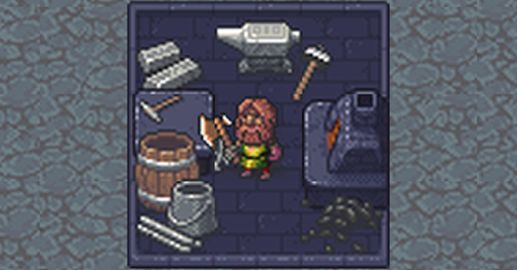 La fusione produce barre di metallo che vengono poi lavorate in Build (b) > Workshop (o) > Metalsmith’s Forge (i). È lì che realizzerai di tutto, dalle armi ai mobili agli strumenti, un processo che utilizza più carburante.