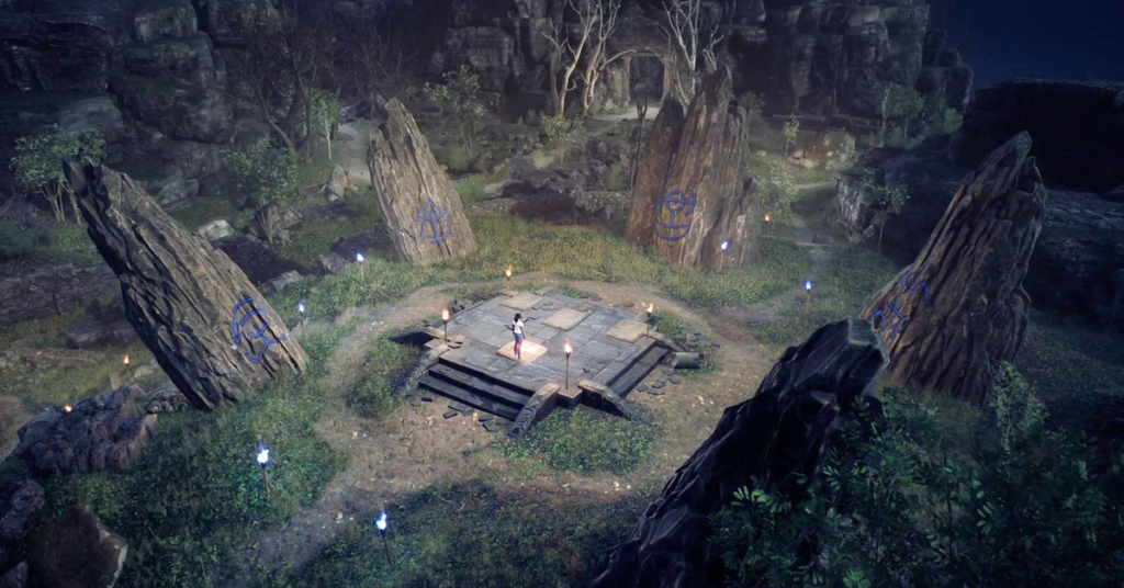 Le pietre erette si trovano sul lato est dei terreni dell’abbazia. Per raggiungerli, dovrai usare la prima Parola del Potere per aprire le porte che bloccano l’area. Mentre sei sulla piattaforma centrale, usa la seconda Parola del Potere per rivelare i sigilli su ogni pietra.