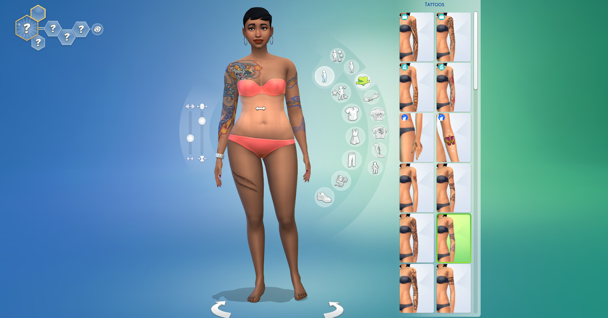 The Sims 4 consente una grande quantità di personalizzazione del corpo; il suo sistema di trascinamento della selezione ti consente di manipolare la forma e le dimensioni delle singole parti del corpo del Sim, in modo da poter scolpire una varietà di corpi diversi. Ha anche opzioni per personalizzare la definizione muscolare, la larghezza del corpo e i tatuaggi. Aggiornamenti recenti hanno aggiunto peli sul corpo e cicatrici. Mentre il gioco ti chiede di scegliere tra avere una struttura “maschile” o “femminile”, i Sims possono indossare qualsiasi capo di abbigliamento indipendentemente dal tipo di corporatura.