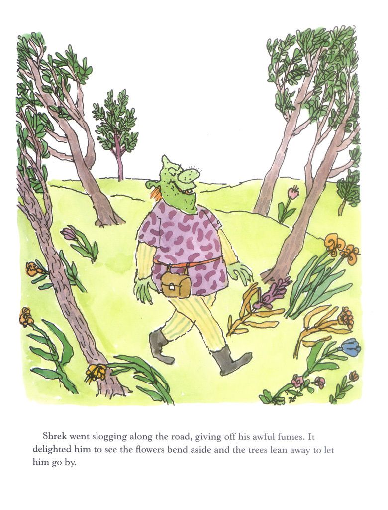 Il libro illustrato originale del 1990 di William Steig Shrek! ha alcuni elementi che i fan di Shrek ricorderanno dal film d’animazione del 2001 che ha ispirato. C’è un grande, verde, goffo protagonista con un intestino prominente e strane piccole antenne auricolari. (Eartennae?) È rozzo e brutto, ma è estremamente orgoglioso del modo in cui spaventa e ribella le persone. E alla fine incontra un asino, si fa strada in un castello e incontra una principessa il cui volto corrisponde al suo.