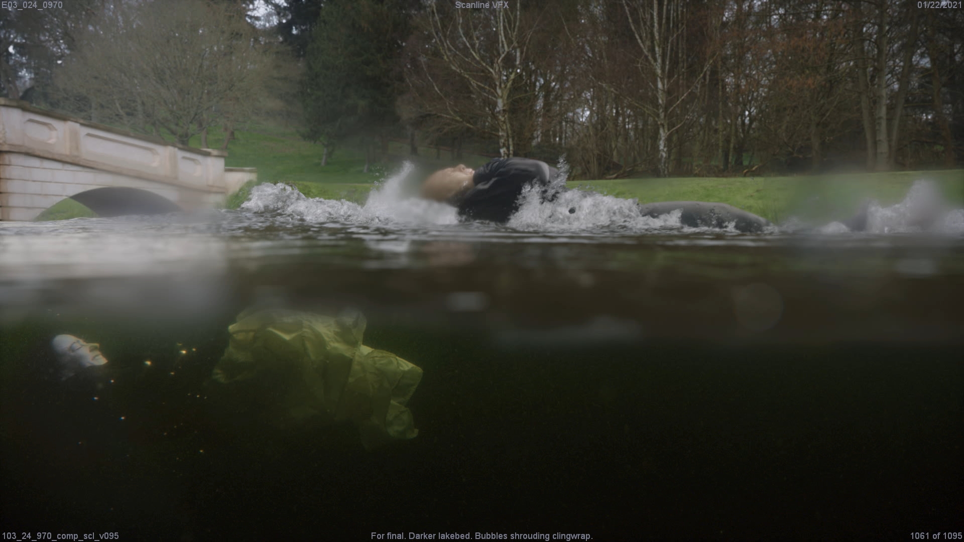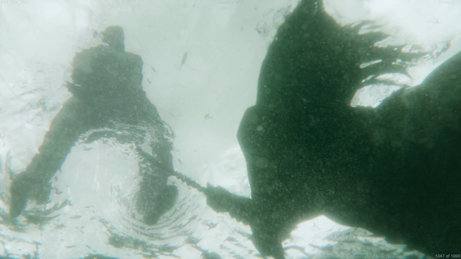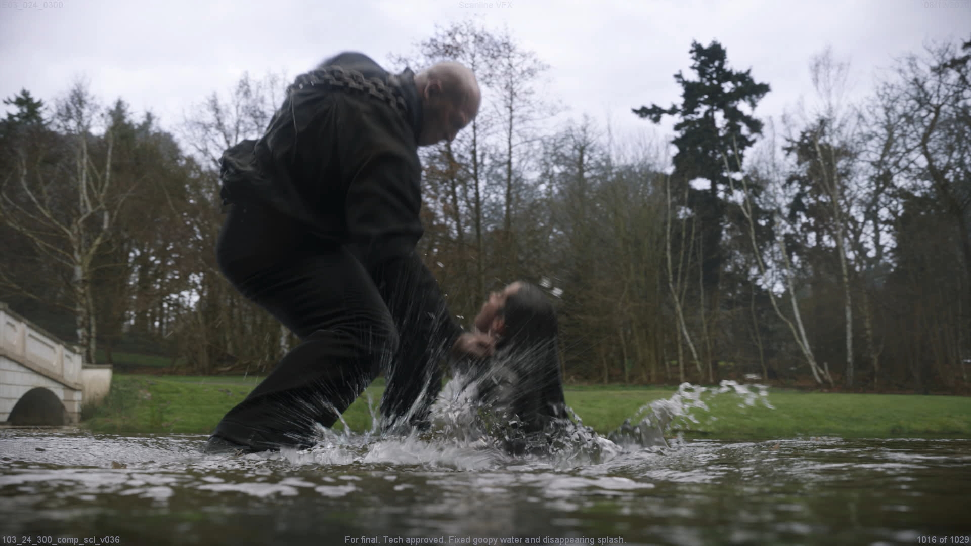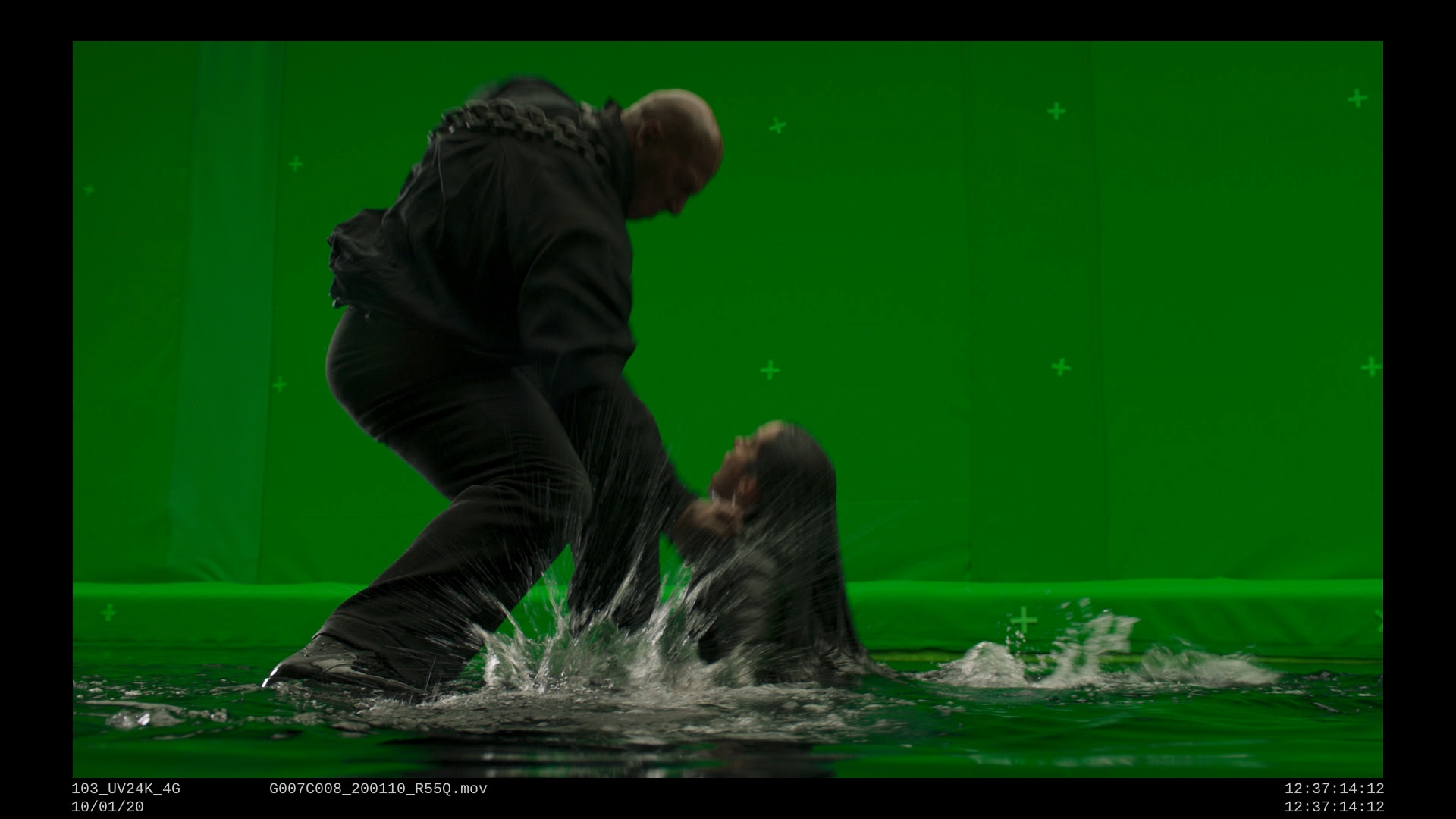 Ancora una volta, Han dice che la maggior parte dell’armeggiare digitale con quella sequenza è stata la sostituzione dello schermo verde con la posizione e la sostituzione della superficie dell’acqua. “La reazione dell’acqua verso di lui che lotta, che è stata sostituita per essere più attivo, per far sembrare che stia davvero lottando, l’acqua sta davvero sciabordando e schizzando contro di lui.”