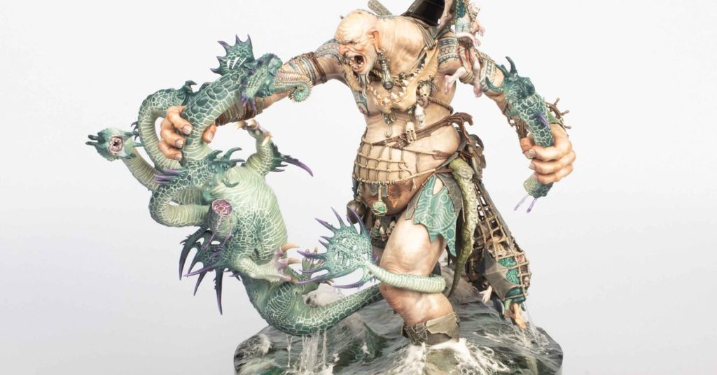 I componenti principali del modello provenivano dal Mega-Gargant mangiatore di Kraken alto 8 pollici ($ 210) e dal Kharibdyss ($ 70), un modello originariamente progettato per la fazione degli Elfi Oscuri in Warhammer: Age of Sigmar. Una grande quantità di riscolpire, ripensare, tagliare, tagliare e incollare in seguito, Clayton aveva le ossa del duello: gigante, idra e tutti i dettagli del fondale marino poco profondo sotto di loro.