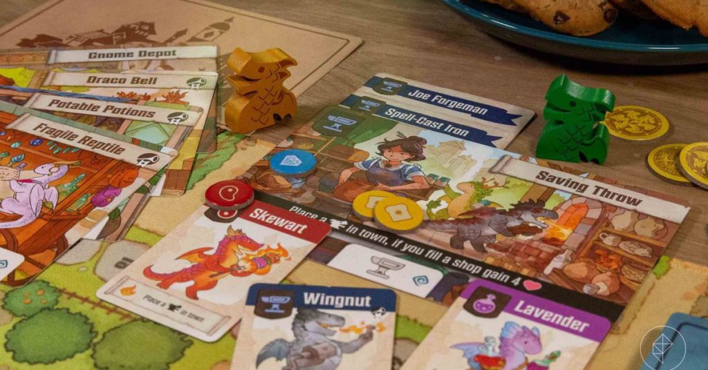Flamecraft è un gioco collaborativo di costruzione di motori in cui i giocatori collaborano per popolare una città in stile Ghibli con draghi artigiani. Insieme, queste piccole creature altamente abili e i loro compagni umani sfornano prodotti come lavori in metallo, piatti di carne e pane appena sfornato. I giochi di parole sono fuori scala, con vetrine con nomi come Fogo de Char (un macellaio), Gnome Depot (che vende calderoni) e Tiro Salvezza (per tutte le tue esigenze di ceramica). Lo stesso tipo di giocosità si estende a e attraverso ogni elemento del gioco, persino i draghi stessi, con soprannomi come Cutlet, Dandelion e Flint.