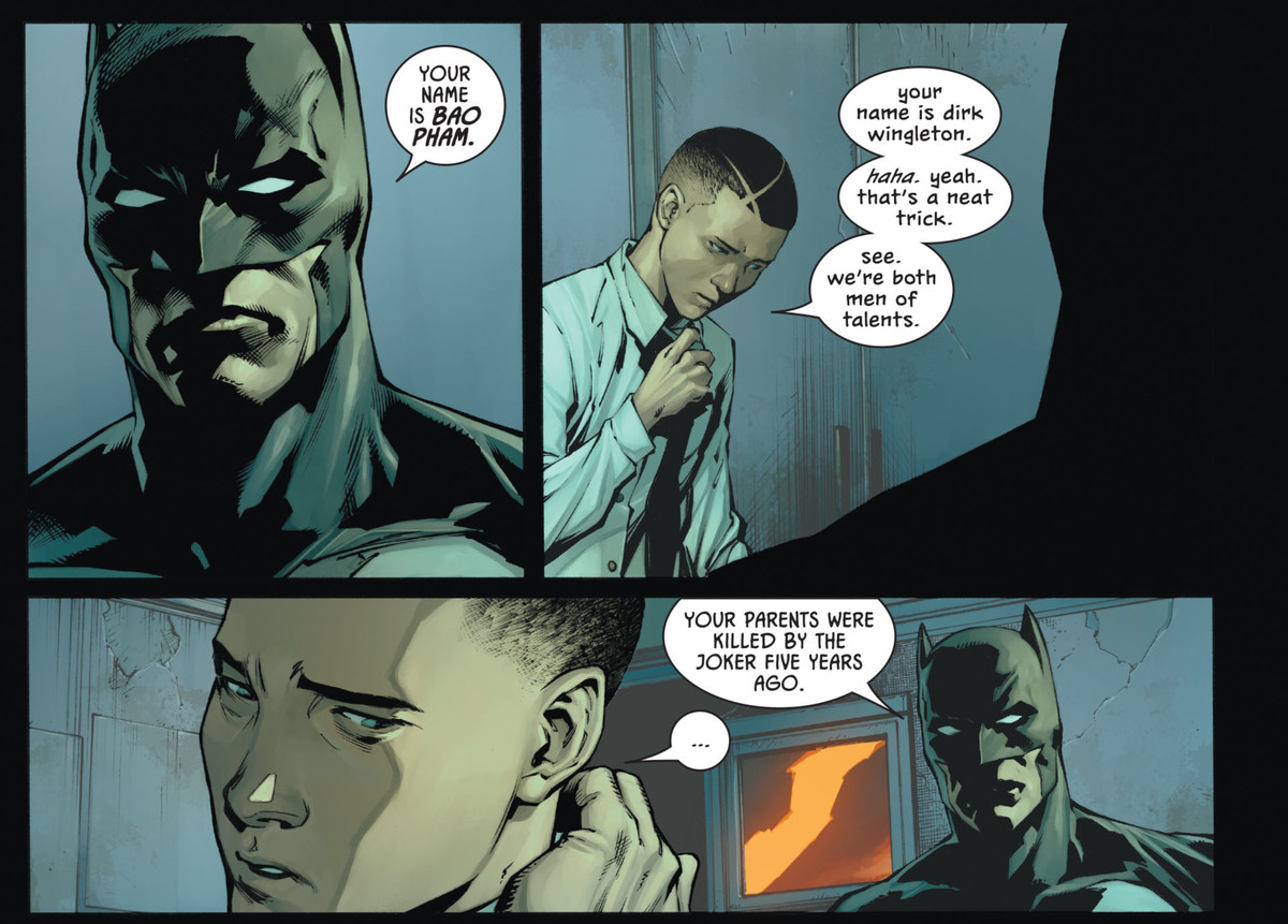 Clownhunter smascherato! Il giovane vigilante che vuole uccidere il Joker, e tutti i suoi scagnozzi, e chiunque indossi una maschera da Joker per saccheggiare un negozio, è il ragazzino orfano Bao Pham. Se ti stai chiedendo se Batman sia riuscito a contattarlo riguardo agli omicidi, la risposta è no.