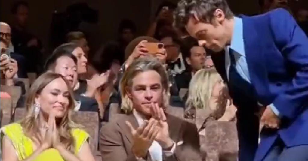 Prendendo posto accanto a Pine per guardare il film, Styles si china brevemente sul suo co-protagonista. Pine si blocca a metà dell’applauso e si guarda in grembo, come se qualcosa fosse appena atterrato lì, o forse sulla sua scarpa. Sorride e scuote leggermente la testa, come incredulo, prima di stabilire un contatto visivo con Styles. Entrambi rimangono sorridenti.
