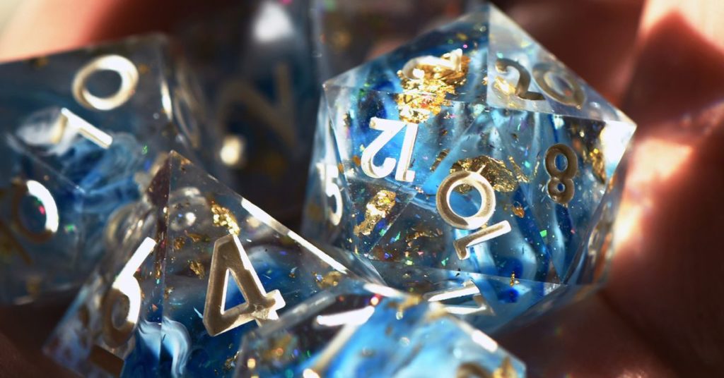 Abrate e Wang si distinguono entrambi dalla massa per come fanno i loro dadi e da cosa li fanno. Wang si affida alla resina liquida, un po’ come la colla bicomponente che puoi acquistare nei negozi di ferramenta, e a nuove inclusioni per dare alle sue creazioni profondità e brillantezza. C’è anche il marchio che accompagna i loro nomi: Crimson Nebula, Eldritch Fire, Magenta Inferno, Faewater, ognuno un’opportunità per entrare in contatto con i fan di un certo tipo di gioco di ruolo o campagna.