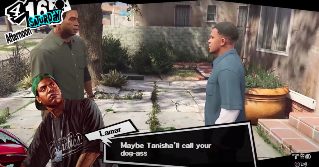 Da allora, c’è stato un aumento nei video che mostrano mod che reinventano la scena sopra, dove Lamar strizza Franklin per essere brutto. Ad esempio, ecco la versione dell’arrosto dell’utente di YouTube Daymon, resa come se fosse una scena del gioco di ruolo giapponese Persona 5.