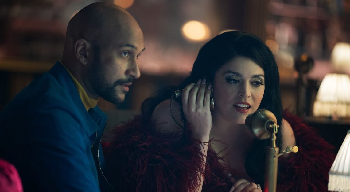 Schmicago separa anche i suoi precursori più politicamente consapevoli dalla sua politica. Per questo scenario di Cabaret, il nazismo non inghiotte il cabaret del Kit Kat Club (come fa nella messa in scena di Sam Mendes, che vede Cumming nei panni dell’Emcee). Evitando il contesto specifico della guerra del Vietnam (e qualsiasi immagine che assomigli a quella in cui il cadavere di un soldato giace sulla bandiera americana), Hair è impegnato nella lotta contro un monopolio elettrico. È comprensibile per la coerente costruzione del mondo crossover, ma Schmicago può sembrare un’opportunità persa per cogliere appieno i bordi e la profondità di questi musical. Il solenne momento di nudità di 20 secondi in Hair suscitò all’epoca polemiche; nella stagione 2 di Schmigadoon, il momento è inquadrato come “haha, questi hippy si spogliano”. Schmicago pecca per eccesso di divertimento lasciando a malapena spazio all’oscurità che fa riflettere, appiattendo gli strati del materiale a cui si riferisce amorevolmente.