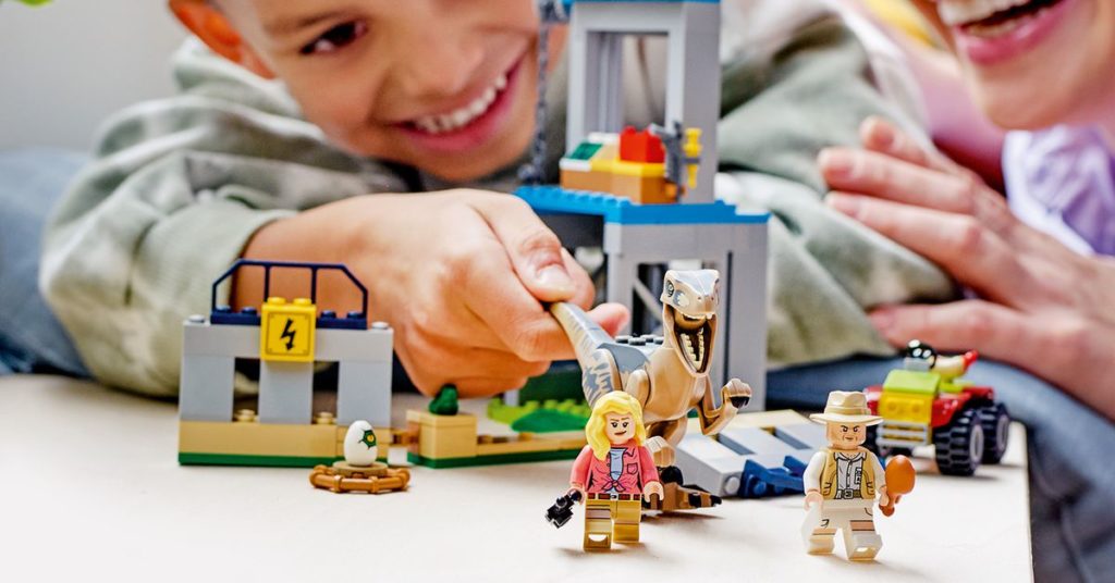 # 76957 Lego Jurassic Park Velociraptor Escape: presentato come set iniziale per i fan di Lego di 4 anni, questo set ricrea un recinto di rapaci in cui il dottor Sattler e il dottor Grant danno da mangiare alle creature (un hot dog e una coscia di tacchino , a quanto pare) prima che i dinosauri escano e scatenino l’inferno. Include le due minifig e un ATV per una fuga veloce, $ 39,99.