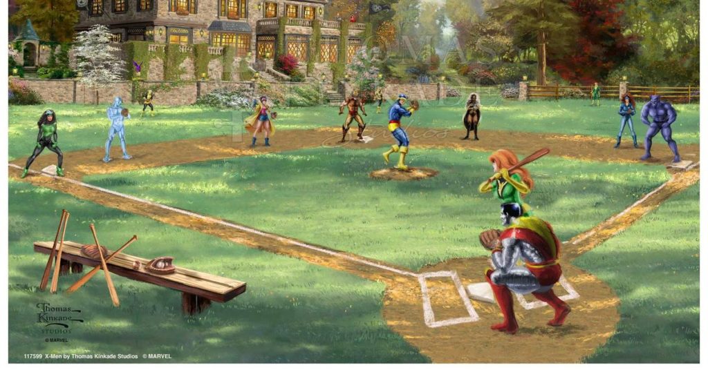 Detto questo, la descrizione di questo dipinto da parte di Kinkade Studios specifica che raffigura uno dei rari momenti in cui gli X-Men stanno giocando a baseball senza usare i loro poteri. Non inaudito, ma non necessariamente la norma. Inoltre non è la norma? Giocando nei loro completi da supereroe. Inoltre, Iceman e Colossus stanno usando visibilmente i loro poteri. Ad ogni modo, ecco la descrizione ufficiale: