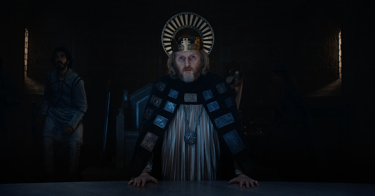 Palermo descrive quella sequenza di apertura come “un’inquadratura piuttosto semplice, solo una semplice spinta”, ma l’immagine è inquietante e sorprendente: l’aspirante cavaliere Gawain (Dev Patel) seduto cupamente su un trono nella Sala Grande di Re Artù, con una corona che scende lentamente sulla sua testa dall’alto. Quando viene incoronato, la sua testa prende fuoco, ma continua a fissare il pubblico, senza battere ciglio. Sembra il tipo di sequenza che verrebbe normalmente creata con un’ampia CGI, ma Palermo dice che lui e Lowery hanno girato tutti gli elementi con effetti pratici, il giorno in cui hanno scoperto che il loro serbatoio dell’acqua era impraticabile.