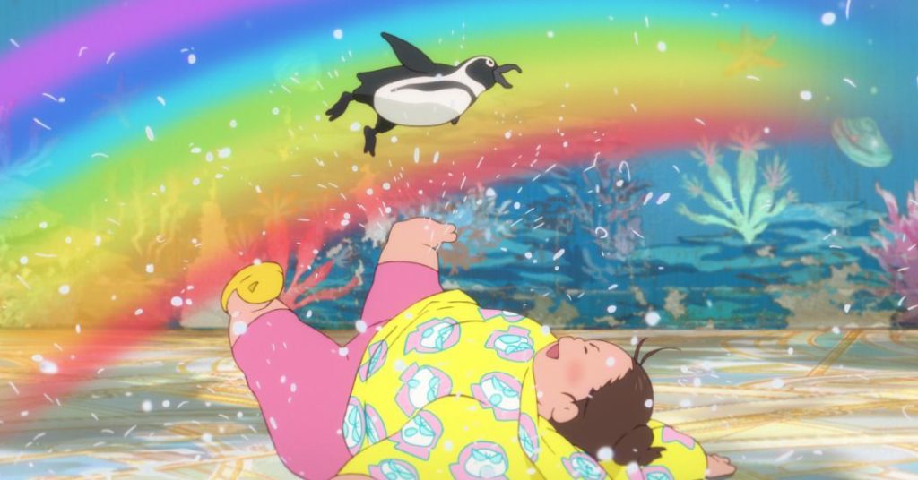 Il peso di Nikuko, il suo volume e la sua irrefrenabilità sono uno degli obiettivi principali di Fortune Favors Lady Nikuko, e ci vuole un po’ per chiarire che ciò che gli spettatori vedono sullo schermo riflette le percezioni interpolate di Kikuko molto più di quanto rifletta la realtà. Nikuko è descritta all’inizio del film come un peso di 67 chilogrammi, o poco meno di 150 libbre, ma è disegnata come una sfera flaccida, quasi informe. In forma, è una voce morta per Totoro da My Neighbor Totoro dello Studio Ghibli, a cui Watanabe fa esplicitamente riferimento più volte, inclusa una scena che rispecchia la famosa sequenza della fermata dell’autobus sotto la pioggia di Totoro. Anche il russare sonoro di Nikuko, il suo gigantesco sorriso a trentadue denti e il suo intenso entusiasmo per la vita corrispondono a quello di Totoro. Ma Kikuko, al pari di tanti adolescenti e preadolescenti in tutto il mondo, trova sua madre orribilmente imbarazzante.