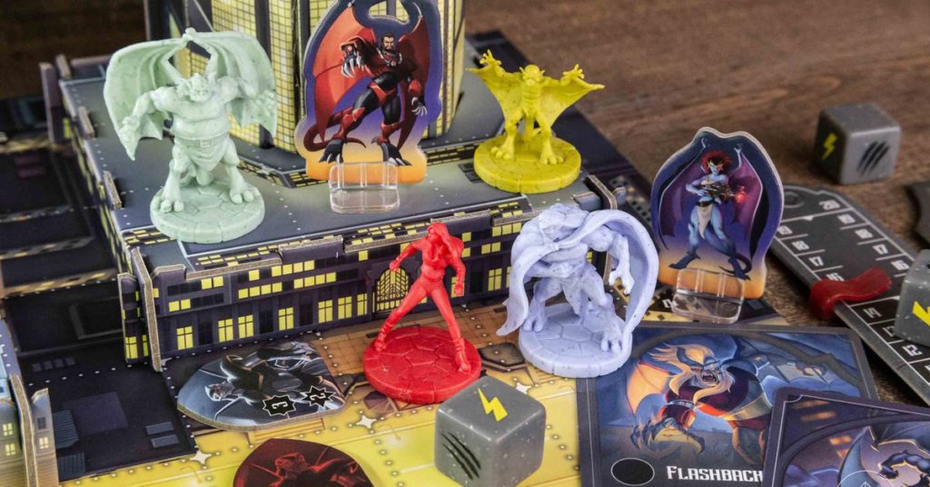 Gargoyles: Awakening è un gioco incentrato sul combattimento che prende ispirazione da alcuni dei migliori episodi dello show. La vera chicca in questo gioco sono tutti i pezzi fisici all’interno della scatola. C’è un sontuoso tabellone di gioco, con una scena della città di Manhattan da un lato e arte monocromatica dall’altro. Ci sono anche cinque sostanziali edifici di cartone a incastro, che danno allo spazio di gioco lo stesso tipo di scala dinamica della serie animata. L’editore Ravensburger è arrivato al punto di lanciare i Gargoyle titolari in una plastica testurizzata e colorata che non assomiglia a nessun’altra miniatura della mia collezione.