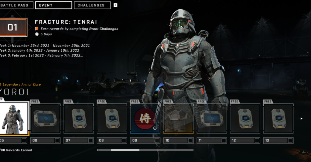 La grande ricompensa dell’evento Frattura di Halo Infinite: Tenrai è l’armatura da samurai Yoroi del gioco. L’evento si svolge nel corso di diversi mesi e include un proprio pass evento gratuito separato (simile al normale pass battaglia del gioco) che sblocca pezzi dell’armatura ogni pochi livelli.