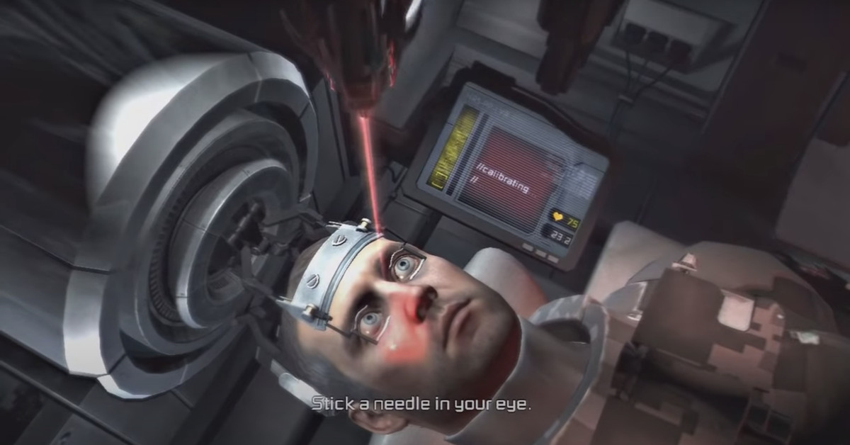 Se hai giocato a Dead Space 2, ti ricordi la scena “ficcati un ago nell’occhio”. Verso la fine del gioco, il protagonista Isaac Clarke si arrampica su un aggeggio per un intervento chirurgico agli occhi in modo da poter ricevere alcuni dati sui mostri che sta combattendo. Questi dati devono essere inseriti attraverso il suo occhio nel cervello tramite un ago, perché certo. Durante questa scena orribilmente interattiva, il giocatore deve guidare quell’ago nella pupilla di Isaac mentre è legato alla macchina, contrandosi in un’agonia a malapena contenuta.