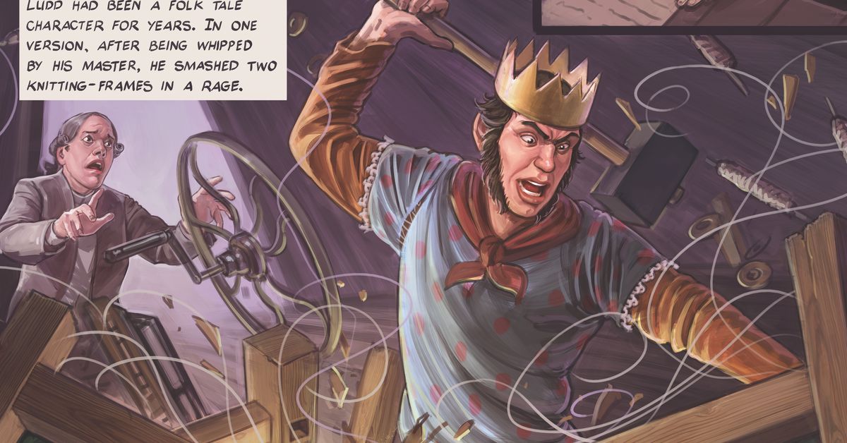 “Finiamo con l’idea che alcuni strambi abbiano deciso che la tecnologia fosse malvagia e hanno iniziato a colpirla con dei bastoni”, ha detto Brewis, che ha scritto il breve fumetto, a Viaggio247 via e-mail, “il che è così comicamente assurdo che questa immagine mentale diventa un facile confronto da usare contro critica — Se pensi che sia “cattivo” abbiamo rubato il lavoro di milioni di artisti e lo abbiamo inserito nel nostro computer in modo che possa sputare arte simile alla loro a comando, sei una persona pazza che è contro il progresso, proprio come quei ragazzi.