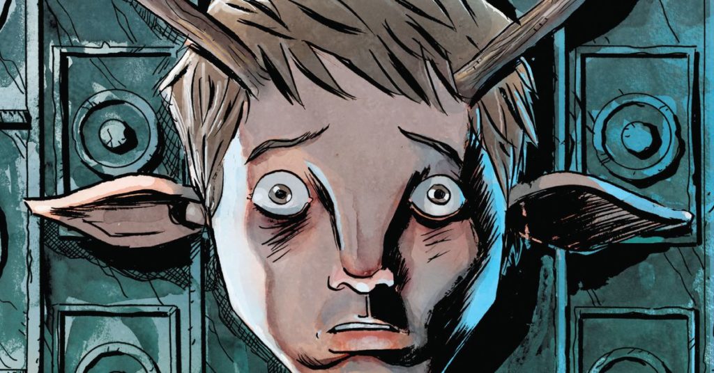 Le battute di Lemire sono più vicine al fumettista che al disegnatore, comunicando le emozioni di base del pannello senza definire molti dettagli. Ma come i migliori fumettisti, se ha bisogno di concentrarsi, sa come fare. Qualcosa non va qui, e non è il ragazzo dall’aspetto carino con le corna. L’abito rosso di “il padre” emerge dai colori tenui del resto dell’ambientazione nelle prime pagine, e qualcosa è seriamente sbagliato in questo ragazzo. Ha una condizione della pelle e dardi che escono dal collo. Ha una faccia seria da Snoke. Si può sempre contare sul fatto che Villarrubia porti il colore, ma l’economia di questo pannello a doppio profilo è Lemire che riesce in qualcosa che non tenta regolarmente.