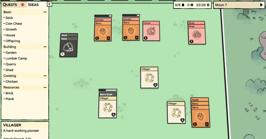 La sfida aumenta, ma non sembra mai una ripida curva di apprendimento. Il primo grande ostacolo è nutrire gli abitanti del villaggio. È così che inizialmente sono andato fuori controllo durante la mia prima corsa: i cespugli di bacche hanno usi limitati prima di scomparire, quindi ho dovuto creare qualcosa di rinnovabile. I miei abitanti del villaggio sono morti di fame prima che potessi capirlo. Alla mia seconda corsa, ho accumulato cibo prima di rendermi conto che c’era un limite massimo di carte. Il gioco lancia anche stupide palle curve. Le carte caotiche casuali compaiono nei pacchetti di carte, come un “pollo” che ha prodotto “uovo” – ottimo per creare “frittata” – ma il dannato pollo ha anche vagato per lo spazio di gioco, causando il caos. Le mie ordinate pile di carte divennero uno splay disorganizzato.