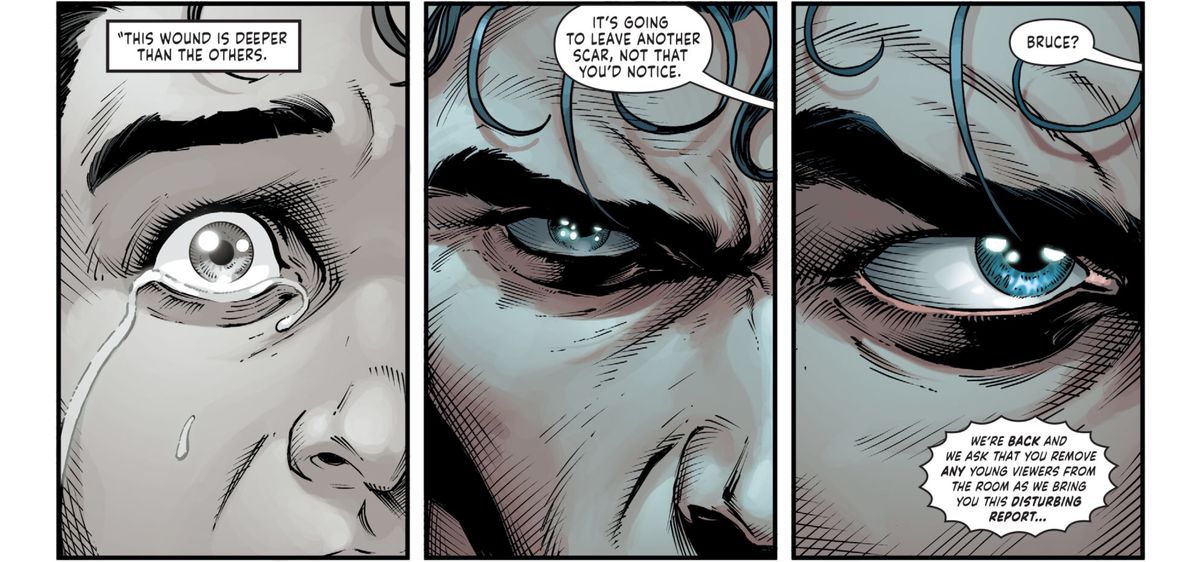 Three Jokers sta cercando di essere qualcosa che chiunque può prendere da uno scaffale e leggere, il che significa che deve stabilire le diverse relazioni – e traumi – che Batman, Batgirl e Jason Todd hanno con il Joker. Johns e Fabok lo fanno in 15 pagine estese che includono anche la morte dei Wayne. Quel particolare flashback termina con una forte giustapposizione di immagine e testo: “Questa ferita è più profonda delle altre”, dice Alfred, riferendosi ai punti che ha messo sul fianco di Batman, ma le parole sono sopra un pannello in cui Bruce ricorda come ha guardato il suo l’assassino dei genitori fugge dalla legge.