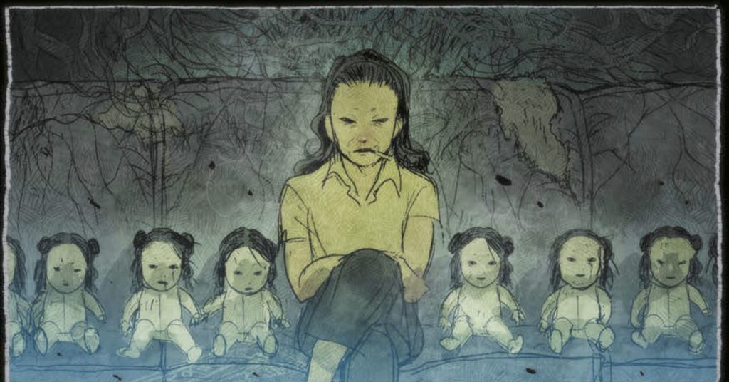 Le bambole incredibilmente inquietanti svolgono un ruolo significativo nel primo romanzo grafico autonomo di Night Eaters. Vedi sotto per un esempio del libro mentre Ipo inizia a riflettere su come gestirà la casa infestata ed entra per uscire con il suo complemento di giocattoli maledetti.