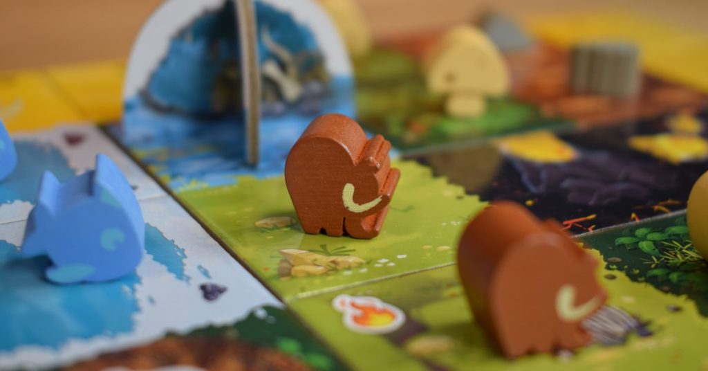 Di conseguenza, è nato Kingdomino Origins. Invece di un tema medievale, il gioco riporta indietro l’orologio ai tempi preistorici. Invece di competere solo per i punti vittoria, i giocatori cercano invece di accumulare più risorse: mammut, pesci, funghi e selce. Nella modalità di gioco più avanzata ci sono anche vulcani eruttanti di lava che lanciano detriti infuocati sulla mappa. Quella che una volta era una pianura aperta per gli antichi elefanti può diventare rapidamente una landa desolata e bruciata. I giocatori possono anche spendere punti per assumere aiutanti aggiuntivi, piccoli uomini e donne delle caverne che possono aiutarli a guadagnare più punti.