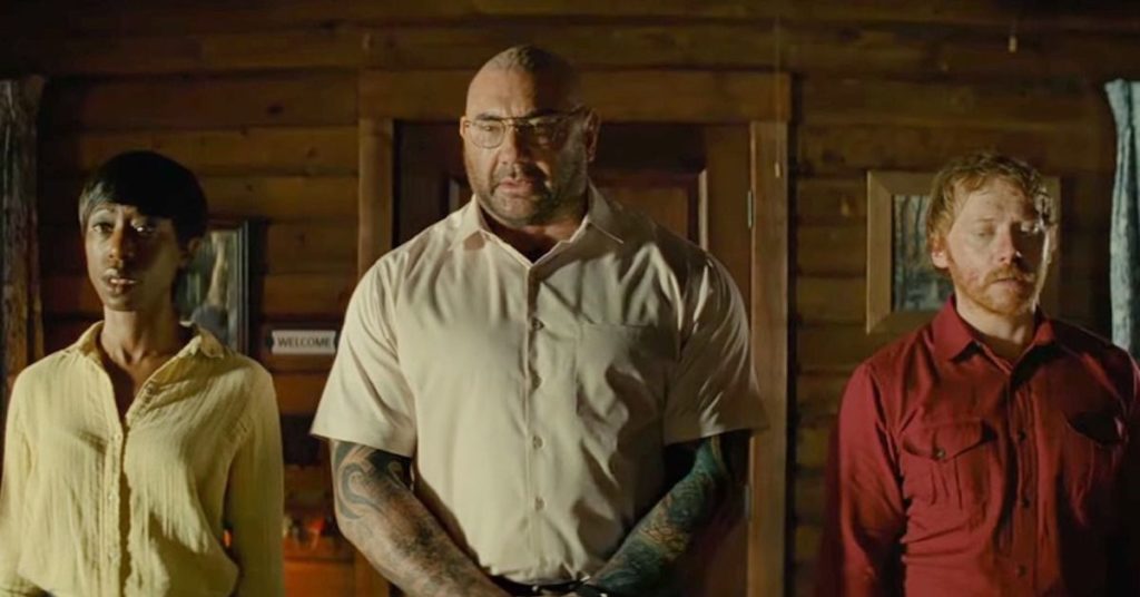 Jonathan Groff (The Matrix Resurrections) e Ben Aldridge (Our Girl) recitano nell’ultimo horror-thriller di M. Night Shyamalan nei panni di Eric e Andrew, una coppia sposata la cui tranquilla vacanza in una baita remota con la figlia (Kristen Cui) è interrotta da l’intrusione di quattro sconosciuti armati guidati da un uomo occhialuto, pacato e intimidatorio di nome Leonard (Dave Bautista). La loro missione? Per prevenire l’apocalisse. La presa? Un membro della famiglia di Eric e Andrew deve morire per impedirlo e la famiglia stessa deve scegliere chi tra loro deve essere sacrificato.