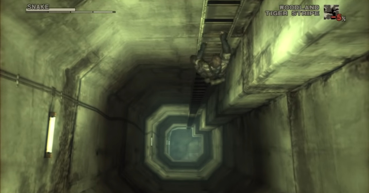 Nell’exploit, Solid Snake assume una posa a T dopo alcuni problemi di menu e – presto! — il cigno si tuffa nella stanza sopra la lunga scala a pioli. Questa clip proviene dal remake HD pubblicato nel 2011 su PlayStation 3.