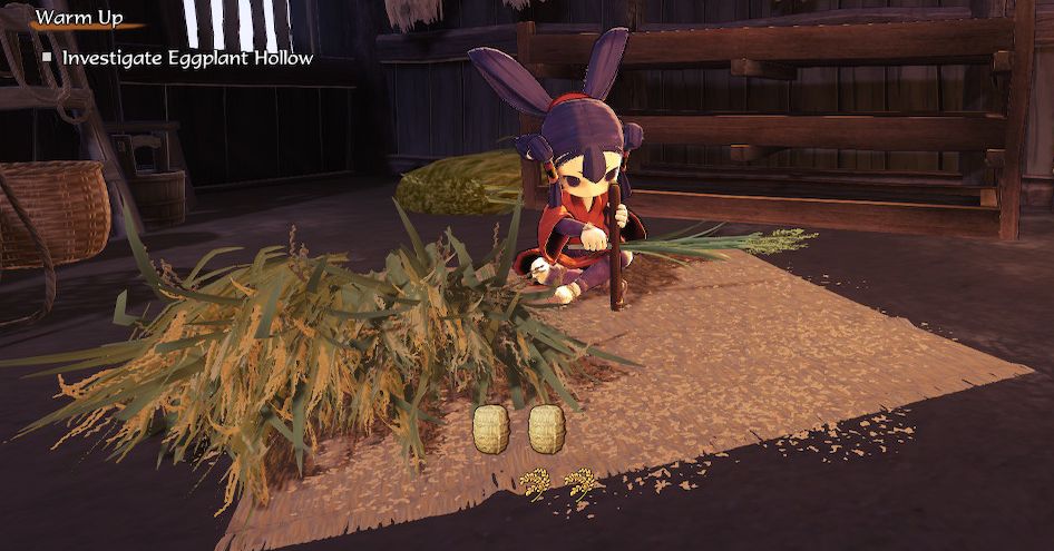 Durante queste sezioni di piattaforme, ti imbatterai in cespugli e metalli su rocce che puoi coltivare per materiali come minerale di ferro, ambra, canapa, quercia e altro. Dopo aver terminato uno di questi tanti segmenti di esplorazione, tornerai a casa, ed è qui che inizia la carne del gioco. Sarebbe l’agricoltura, che è ciò che mi ha veramente fatto credere che Sakuna è un capolavoro.