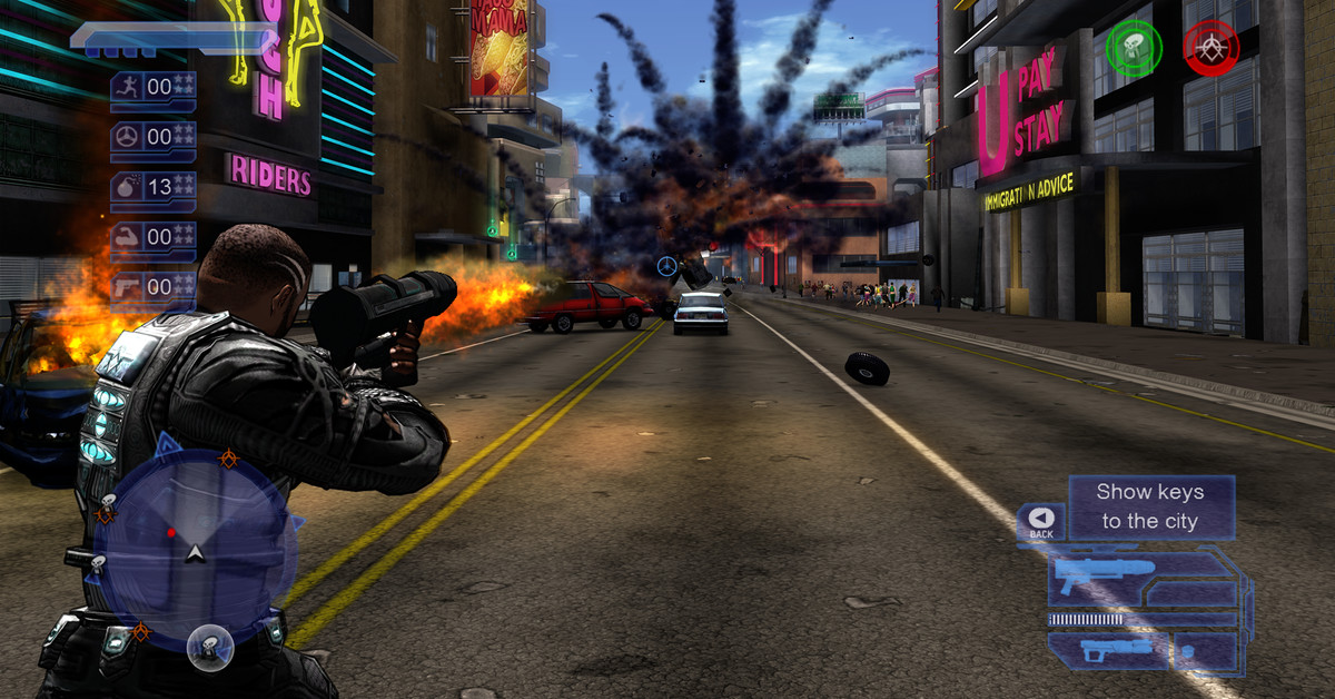 Il gioco era in anticipo sui tempi. Letteralmente. Sulla mia Xbox 360 funzionava come una Chrysler Imperial di 30 anni, soprattutto quando ho lanciato la modalità Keys to the City, che mi ha permesso di generare pile di nemici, veicoli e barili combustibili. L’esplosione di tutto questo casino metallico e umano sarebbe apparsa sul mio televisore CRT in esplosioni caotiche di animazione, la Xbox 360 che provava il suo meglio a caricare tutto il caos visivo, sbuffando e sbuffando e quasi dandosi un’ernia.