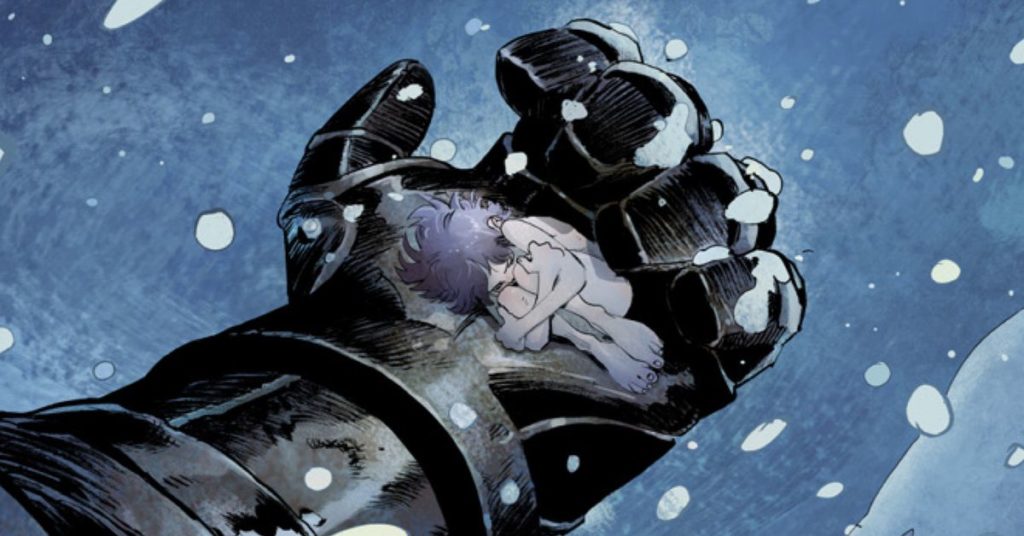 Step by Bloody Step è pieno di grandioso spettacolo ambientale e azione gigante contro mostri, ma c’è altrettanta magia nei momenti più piccoli, che mostrano un lato diverso dell’ingegnosità di Bergara. La prima volta che il Gigante lascia la Ragazza fuori dalle sue mani, vede un fiore appeso sopra di lei e lo prende. Questa sequenza a tre pannelli fa cose brillanti con la spaziatura e la prospettiva per evidenziare l’ignoranza della ragazza del pericolo che la circonda e la sua mentalità infantile. Il primo pannello mostra la Ragazza seduta nuda nella neve, che fissa il fiore che non è nello stesso pannello, ma nella grondaia grigia tra i pannelli. Il modo in cui il fiore rompe i bordi del pannello qui è molto sottile, ma mette in evidenza il modo innovativo in cui Bergara considera la relazione tra immagini bidimensionali e spazio tridimensionale.