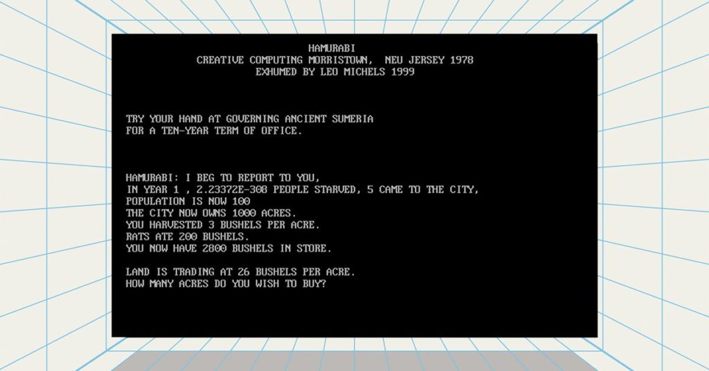 Nei laboratori informatici scolastici degli anni ’70, i giochi ponevano molte domande. Più precisamente, hanno chiesto molti numeri. I numeri digitati erano il carburante necessario per alimentare i giochi – in genere brevi programmi scritti in BASIC – che riempivano lo spazio di archiviazione sui minicomputer. Non c’erano schermi, solo macchine telescriventi, che funzionavano come macchine da scrivere, tranne per il fatto che i computer potevano anche digitare le parole sulla pagina. Quando giocavi a un gioco di strategia a turni come Hamurabi, il computer stampava le informazioni chiave, riga per riga: