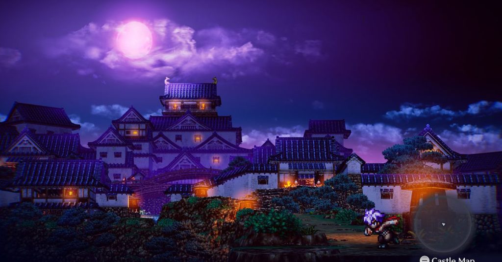 In parole povere, HD-2D colloca sprite 2D e pixel-art all’interno di ambienti 3D che imitano l’aspetto dei classici sfondi disegnati a mano, consentendo al contempo movimenti fluidi della telecamera, illuminazione avanzata ed effetti atmosferici. Posizionare personaggi 2D in mondi 3D non è una novità: la serie Paper Mario è un buon esempio di come un’estetica di successo possa essere svincolata da questi elementi contrastanti. La forza di HD-2D risiede nella capacità di miscelare insieme i suoi componenti. I mondi 3D sono avvolti in trame pixelate per coerenza con gli sprite dei personaggi, mentre l’illuminazione fa sedere i personaggi 2D in modo credibile nella scena senza enfatizzare la loro piattezza. La tavolozza dei colori attinge dai toni ricchi e simili a gioielli dell’era a 16 bit e la profondità di campo esagerata conferisce alla scena un aspetto sognante, inclinato, simile a un diorama. È allo stesso tempo miniaturizzato ed epico: nostalgico e moderno.