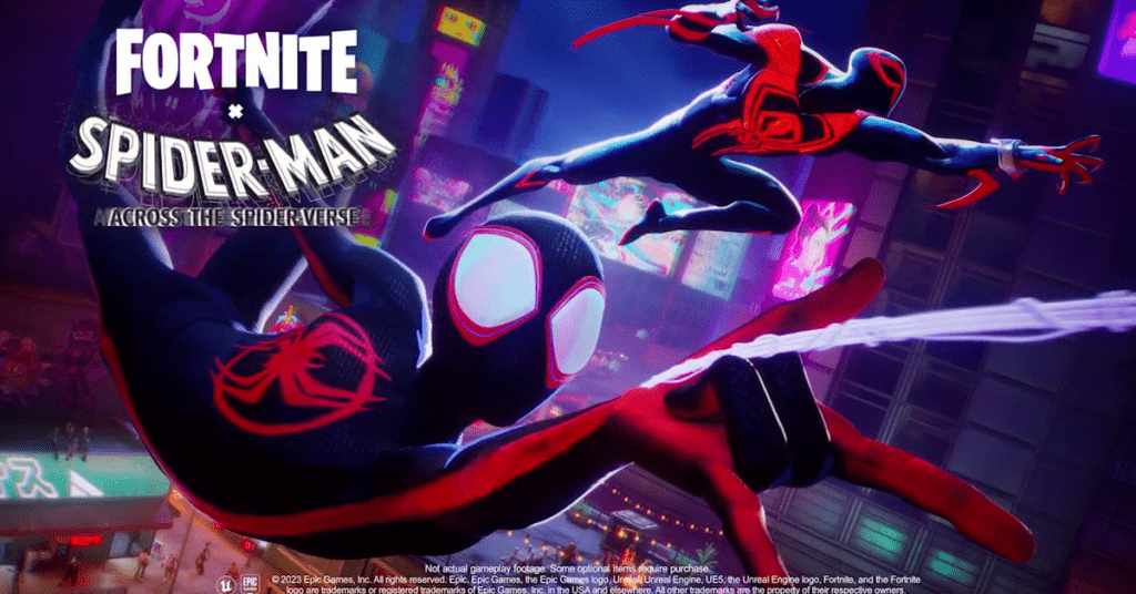 Il video condiviso sull’account Twitter ufficiale di Fortnite mostra Miles che irrompe dalla finestra di un grattacielo e oscilla fuori dall’inquadratura mentre è inseguito da Miguel, un personaggio apparso per la prima volta in una scena post-crediti alla fine di Spider-Man: Into the Spider-Verse e che è fortemente implicito come un antagonista centrale in Spider-Man: Across the Spider-Verse.
