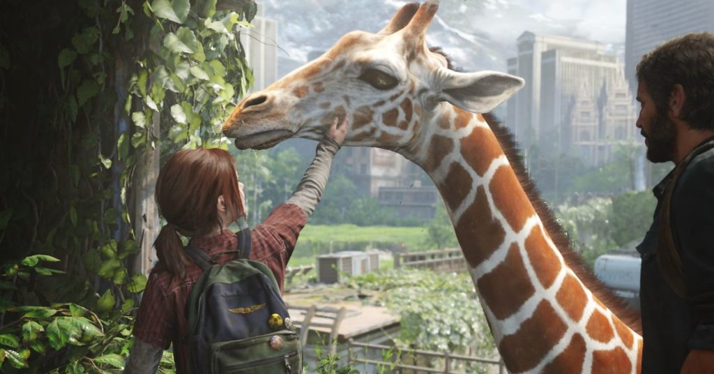 Dopo che Ellie ha abbassato la scala per Joel, sali al secondo piano e segui un’Ellie eccitata, ti condurrà da una giraffa che mangia alcune foglie da un buco nel lato di un edificio. Interagisci con la giraffa per iniziare una conversazione facoltativa.
