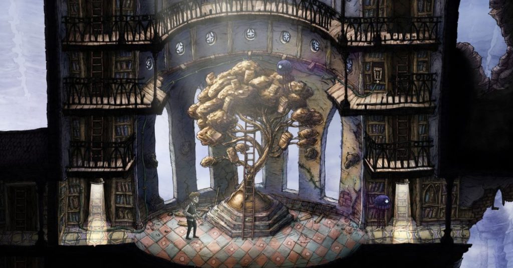 La dimora nascosta, con la sua architettura vagamente vittoriana e l’estetica steampunk-sans-brass, sembra uno spazio vissuto che è stato gradualmente, forse nel corso dei secoli, scavato dalle colossali stalagmiti nella caverna. Sembra anche che potrebbe sgretolarsi in qualsiasi momento a causa dell’attività sismica, naturale o causata dalla misteriosa creatura gigante di cui occasionalmente si vedono squarci. Il personaggio principale è animato in modo immediatamente accattivante: indossa perennemente un’espressione ansiosa, con gli occhi spalancati, le sopracciglia sollevate, come se potesse sciogliersi in un fascio di nervi in qualsiasi momento.