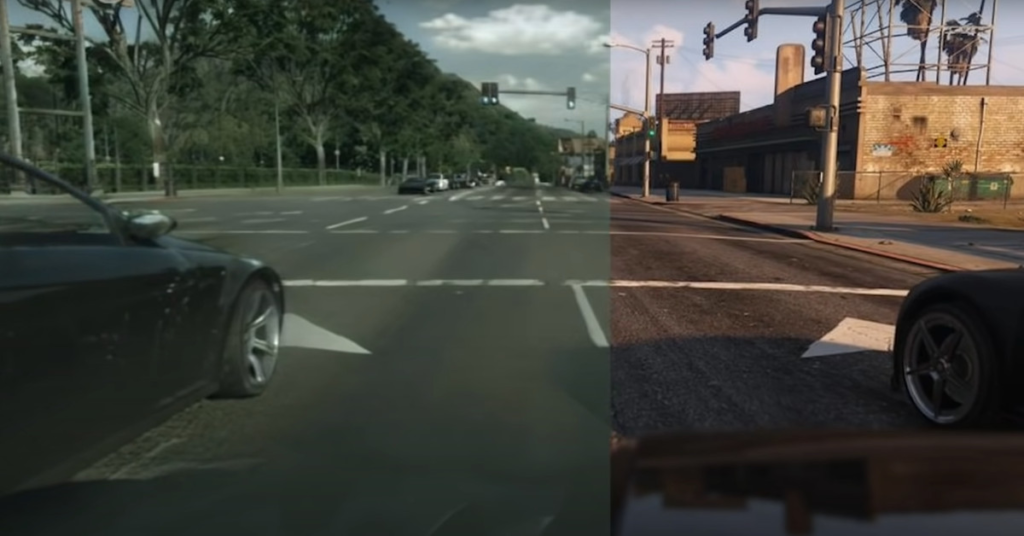 Il video offre confronti fianco a fianco tra il mondo standard di GTA 5 e la versione migliorata, generata da Intel Labs. L’immagine migliorata è particolarmente impressionante in termini di dettagli: riempie i riflessi dei finestrini delle auto, la lucentezza della vernice, l’erba rigogliosa nei campi precedentemente marroni e le foglie sugli alberi spogli.