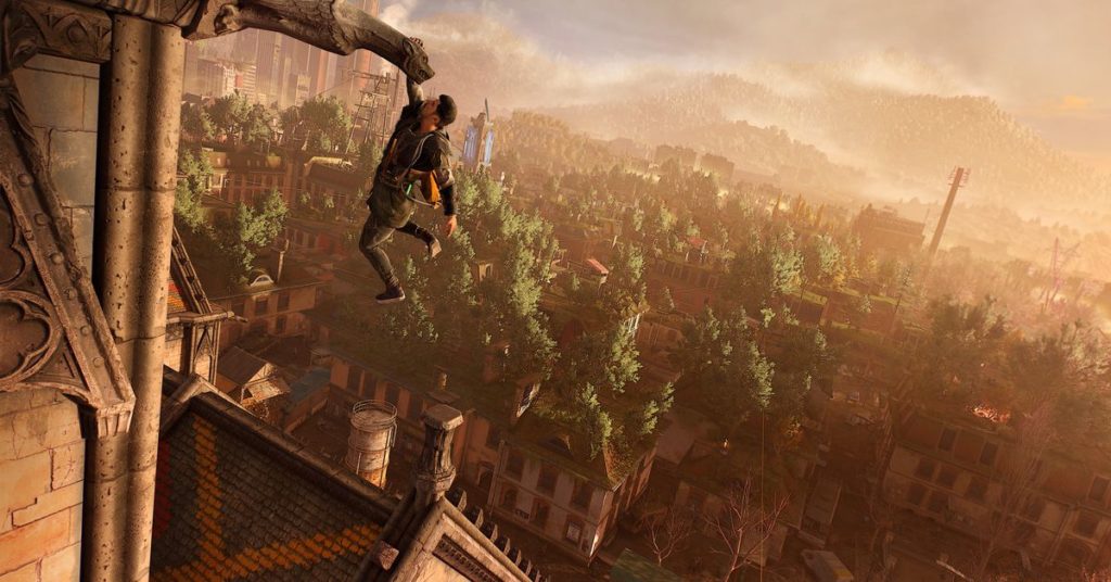 Il parkour in Dying Light 2 è molto più fluido e sicuro rispetto al sistema introdotto dal suo predecessore nel 2015. Alcune delle sue esecuzioni più appariscenti dipendono dall’avere molta familiarità con l’ambiente circostante, ma i salti, le prese e la corsa di Aiden hanno una portata molto più ampia di quella che trasmette la visuale in prima persona. E se sopravvaluvi la sua capacità di fare un salto, c’è un vantaggio di atterraggio attivo che elimina gran parte della puntura anche dalle cadute più grandi. Indipendentemente da ciò, Aiden ha la capacità di trasformare i puzzle di salto in qualcosa che sfida la tua pianificazione più della tua capacità di eseguire mosse. Una volta che vedi il sentiero (di solito utilmente contrassegnato in verde), non è un problema attraversarlo. Basti dire che, con Assassin’s Creed che ha effettivamente abbandonato la sua verticalità, il sistema in prima persona di Dying Light 2 è il nuovo standard nel parkour platform.